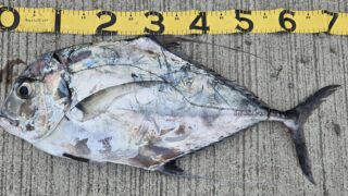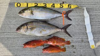 釣果情報 10月14日 26.3℃ルアーでカンパチ64㌢、63㌢。アカバ2枚。他磯アカバ〜35㌢10枚。※トップにいい反応あったようです。デカいの当たったようでした。ロックフィッシュ狙いもよく釣れてました。 2025.10.15 釣果情報