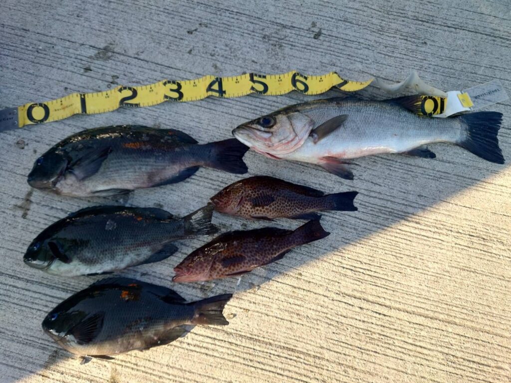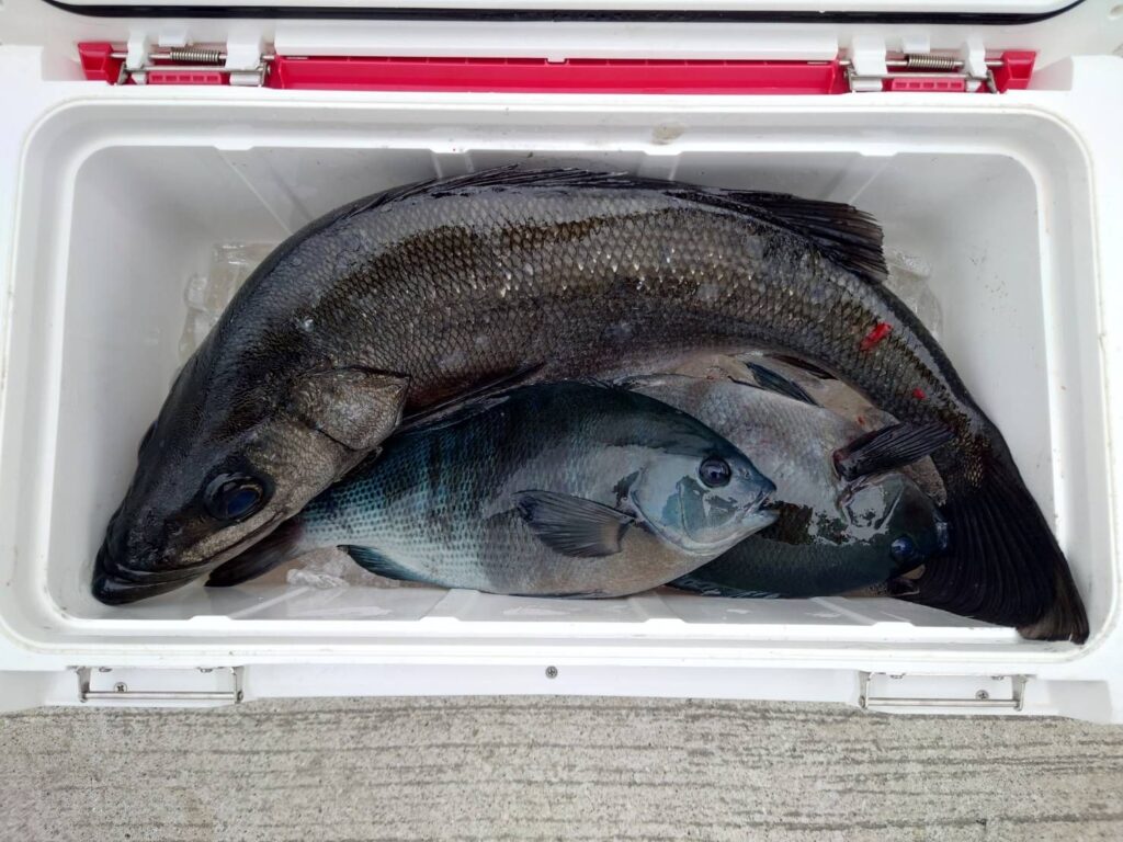 グレ〜47㌢3枚、ヒラスズキ、オオモンハタ2枚。