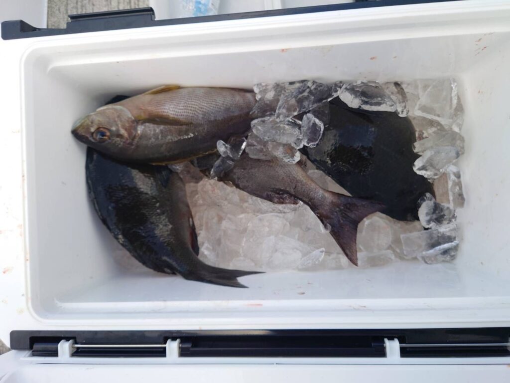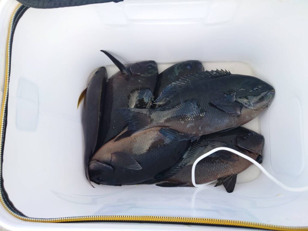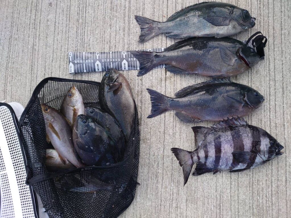 グレ〜48.5㌢11枚、イサギ5枚、石鯛43㌢。グレ〜47㌢3枚、イサギ2枚。