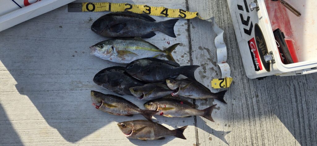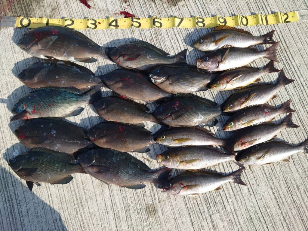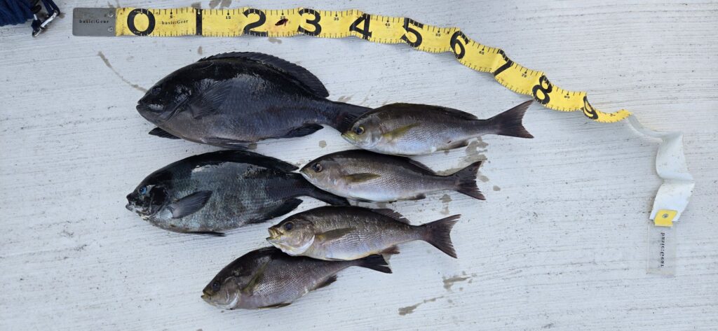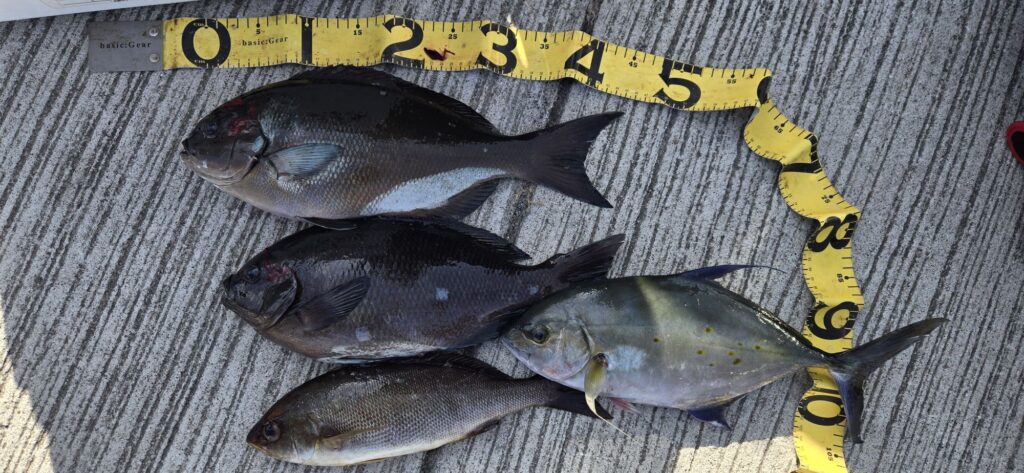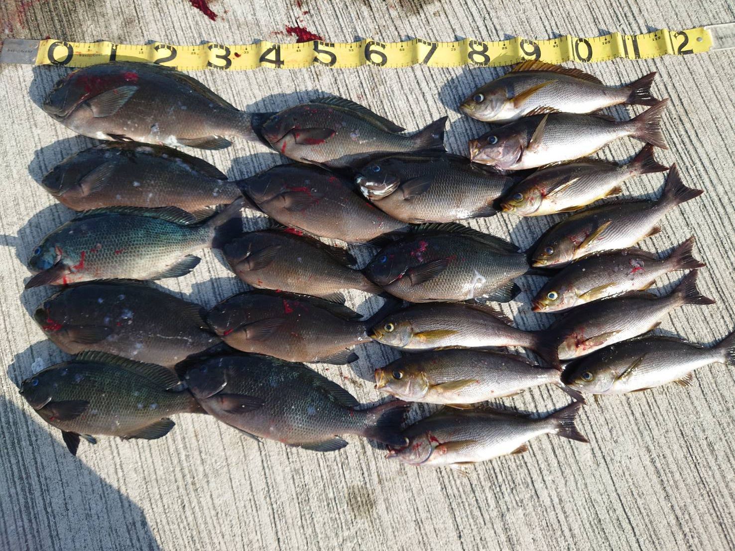 1月18日 釣果情報 2026.01.19 19.0℃ グレ〜45㌢12枚、イサギ10枚。 グレ〜48㌢3枚、シマアジ47㌢、イサギ5枚。 グレ〜44㌢2枚、イサギ4枚。 尾長45㌢、グレ、イサギ、カイワリ。 +イサギ10枚、グレ5枚など。 底物で石鯛45㌢。