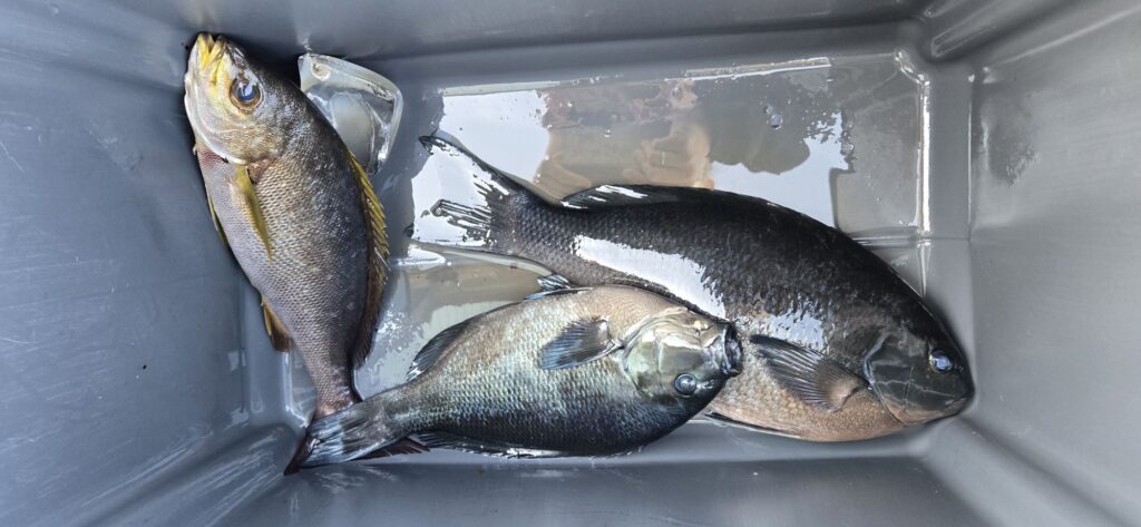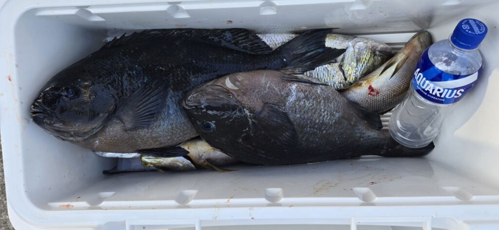 グレ〜44㌢2枚、イサギ8枚。
